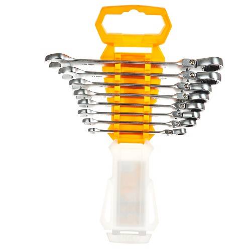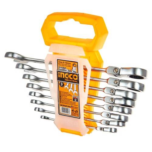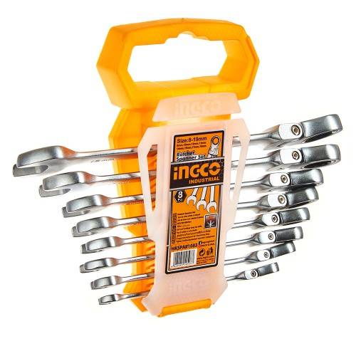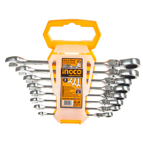Набір ключів храпових комбінованих гнучких 8-19 мм 8 шт. INGCO INDUSTRIAL призначений для проведення ремонтних, складальних та демонтажних робіт з використанням шестигранного кріплення, включає 8 ключів з двома головками - ріжковою та рухомою кільцевою з тріскачковим механізмом. Матеріал інструментів – хромованадієва сталь, тріскачка виконана із міцного хроммолібденового сплаву. Розміри: 8 мм, 10 мм, 12 мм, 13 мм, 14 мм, 15 мм, 17 мм, 19 мм.