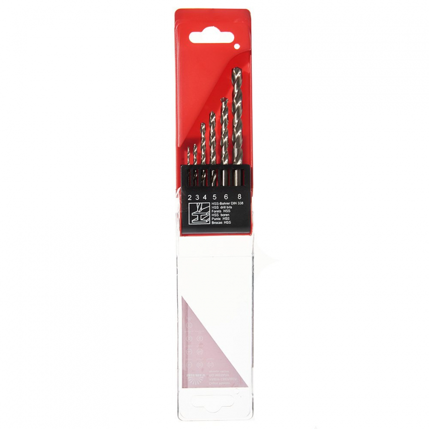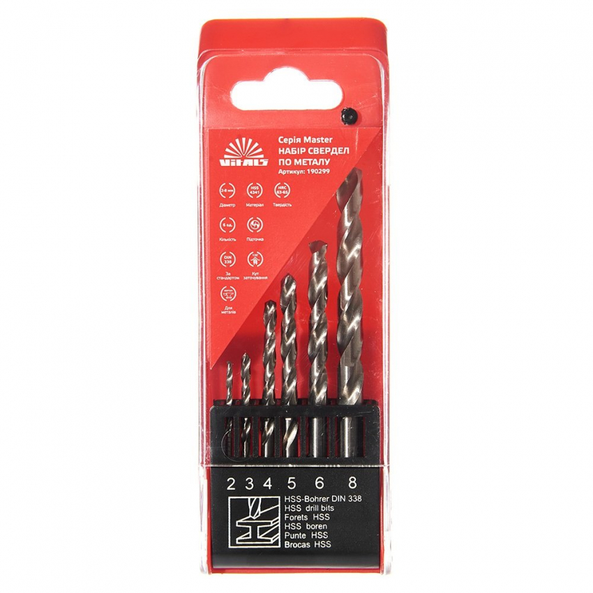 Набір свердл по металу HSS 4341 6 од. 2-8 мм Vitals Master – це професійний набір для свердління отворів у твердих та товстих металевих матеріалах. Набір включає 6 свердл різного діаметра від 2 мм до 8 мм. Свердла виготовлені зі спеціальної швидкорізальної сталі (HSS 4341), яка має високу твердість, зносостійкість та термостабільність. Свердла відповідають стандарту DIN 338, який регламентує геометричні параметри та точність свердл. Кут заточування свердл становить 135°, що є оптимальним для свердління твердих матеріалів, таких як нержавійна сталь, латунь, бронза тощо. Твердість різальних кромок свердл сягає 63-65 HRC, що забезпечує довгий термін служби та високу продуктивність свердління. Підточування вістря свердл забезпечує можливість прямого свердління без попереднього центрування, що спрощує роботу та підвищує точність. Шліфована канавка свердл забезпечує оптимальне виведення стружки та запобігає її застряганню та перегріву. Свердла по металу HSS 4341 6 од. 2-8 мм Vitals Master мають точні геометричні параметри отворів, які відповідають діаметру свердл. Свердла по металу HSS 4341 мають високу зносостійкість і збільшений ресурс, що робить їх ідеальним вибором для професійних і складних завдань зі свердління металу. Набір свердл по металу поставляється у зручному пластиковому кейсі для зберігання та транспортування, який захищає свердла від пошкоджень та забруднень.