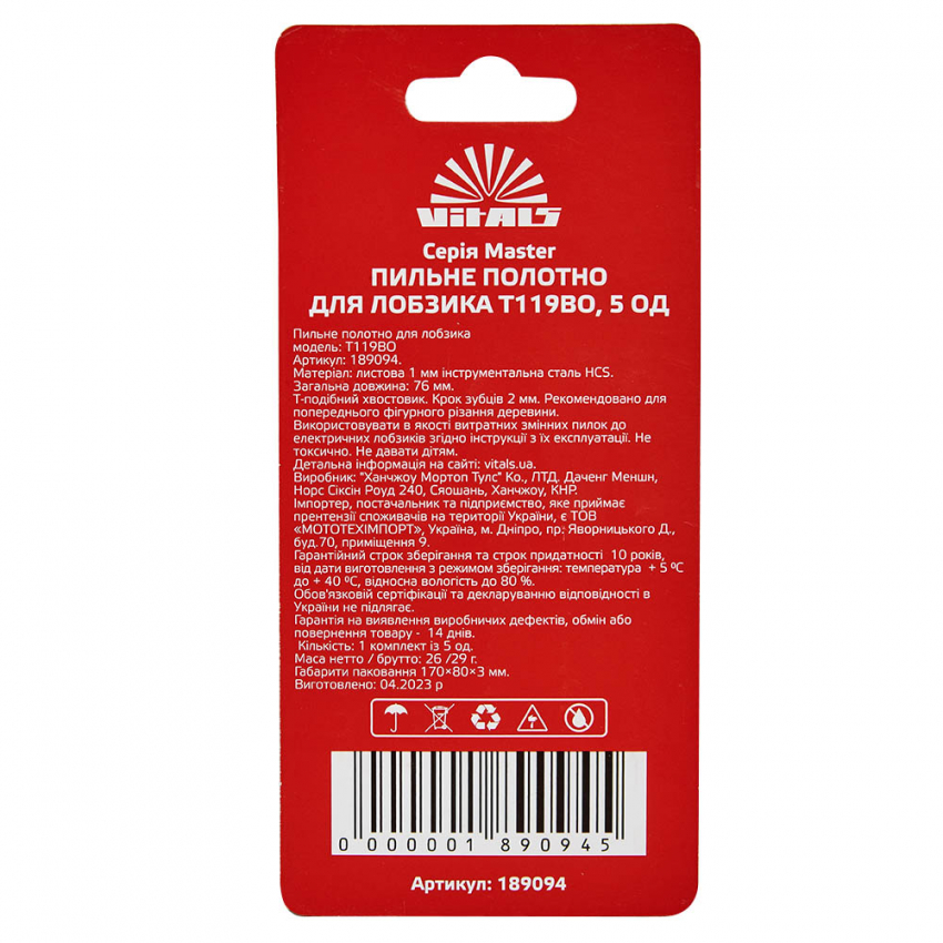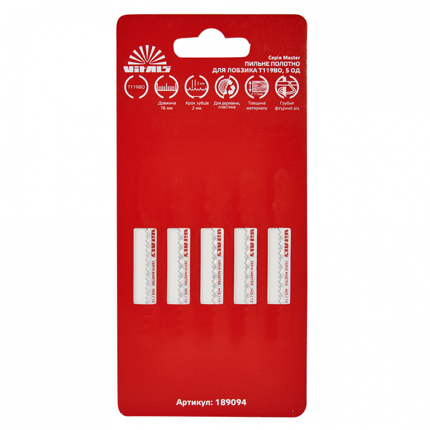 Пиляльне полотно для лобзика Vitals Master T119BO 5 од. підходить для фігурного різання дерева завтовшки від 2 до 15 мм. Полотно виготовлене зі сталі HCS, яка має високу міцність, твердість і зносостійкість. Твердість сталі складає 48 HRC, що гарантує тривалий термін служби та надійну роботу. Підходить для лобзиків із системами кріплення під Т-подібний хвостовик. Постачається в упаковці по 5 одиниць.