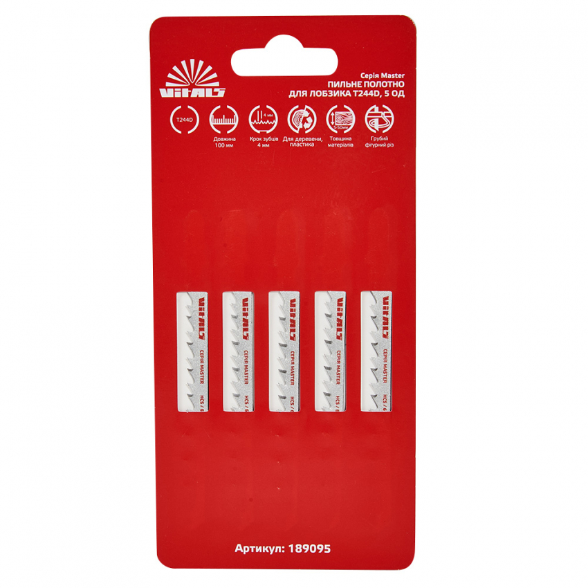 Пиляльне полотно для лобзику Vitals Master T244D 5 од. підходить для фігурного різання дерева товщиною від 5 до 50 мм. Полотно виготовлене зі сталі HCS, яка має високу міцність, твердість і зносостійкість. Твердість сталі складає 48 HRC, що гарантує тривалий термін служби та надійну роботу. Підходить для лобзиків із системами кріплення під Т-подібний хвостовик. Поставляється в упаковці по 5 одиниць.