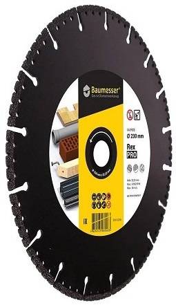 PRO Rex Поріже все. На будівництві, в домашньому ремонті та майстерні не завжди знаєш, який матеріал доведеться різати. Сталь, дерево, пластик, бетон, цегла - матеріали з якими доводиться стикатися найчастіше. Мати спеціалізовані диски для кожного матеріалу - це незручно і дорого. Універсальний диск на всі випадки - це відмінне рішення. Універсальність дисків 1А1R Baumesser PRO Rex забезпечується їх технологією виготовлення методом вакуумного спікання. Алмазні зерна закріплюються в міцній металевій зв'язці в один шар. Зерна в великій кількості височиють над корпусом. Під час різання в роботі знаходяться відразу кілька алмазних зерен з гострими ріжучими крайками. Диски дуже швидко ріжуть будь-які матеріали з постійно високою швидкістю. Для УШМ диски поставляються зовнішнім діаметром 125, 230 мм з посадковим отвором 22,2 мм. Диски діаметром 350 мм з посадкою 25,4 мм застосовується на ручних бензорізах, можуть застосовуватися як в сухому режимі так і з водяним охолодженням.