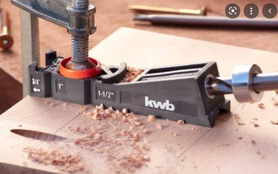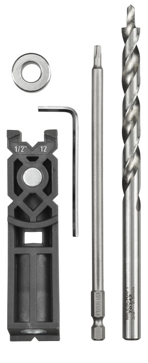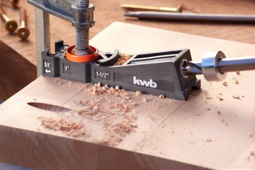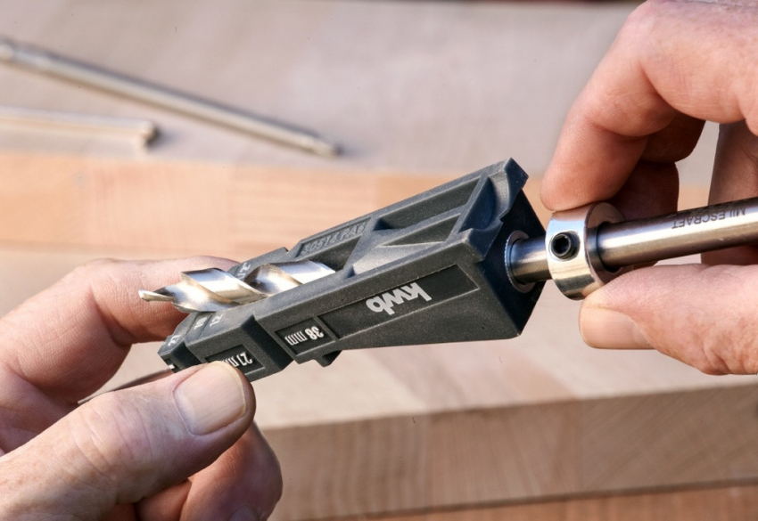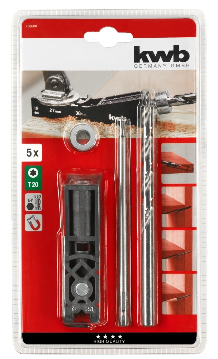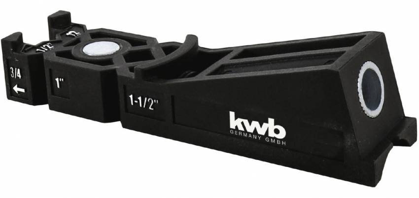 Набір для свердління глухих отворів kwb складається з 5 предметів: кондуктора для свердління глухих отворів, свердла по дереву, обмежувача глибини свердління, біти для шуруповерта та шестигранного ключа. Основний матеріал кондуктора являє собою отвердний пластик, а втулка виготовлена з металу. Завдяки металевому притиску і компактній конструкції кондуктор для свердління глухих отворів kwb затискається за допомогою будь-якого виду струбцин. Потрібна глибина свердління регулюється за рахунок обмежувача, встановлюваного на свердло по дереву. Обмежувач фіксується до свердла за допомогою шестигранного ключа. Кут свердління становить 15°. Шаблон для свердління дозволяє працювати з дерев'яними дошками стандартної товщини 12, 19, 27 і 38 мм.