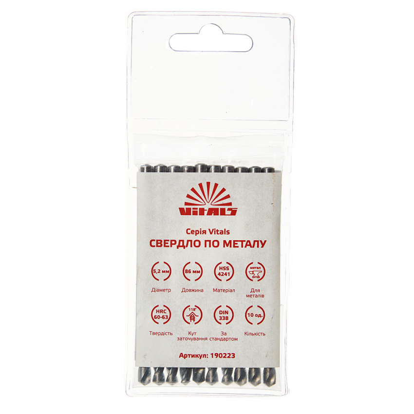 Свердло по металу HSS 5.2 (10 од.) Vitals – це високоякісний інструмент для свердління отворів у різних металевих виробах. Свердло виготовлене з швидкорізальної сталі HSS 4241, яка має високу твердість, зносостійкість і термостабільність. Свердло відповідає стандарту DIN 338, який регламентує геометричні параметри та точність свердл. Кут заточування свердла становить 118°, що є оптимальним для свердління сталі. Твердість різальних кромок свердла сягає 60-63 HRC, що гарантує довгий термін служби та високу продуктивність свердління. Шліфована канавка свердла забезпечує оптимальне виведення стружки та запобігає її застряганню та перегріву. Свердло по металу HSS 5.2 (10 од.) Vitals підходить для роботи з електричними та акумуляторними дрилями. Має циліндричний хвостовик. Поставляється у блістері.