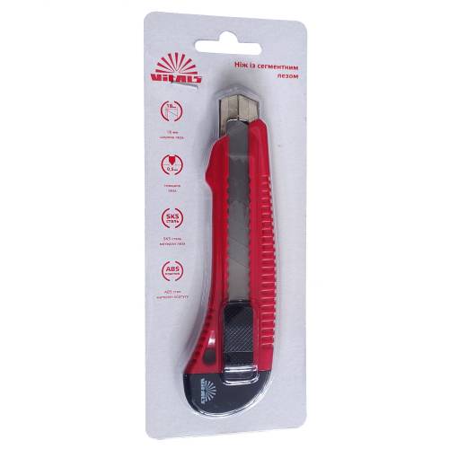 Ніж сегментний 18 мм пластиковий з металевою напрямною Vitals застосовується на будівництві та складах, а також у домашній та офісній роботі. Цей інструмент без зусиль справляється з монтажною піною, шпалерами, скотчем, плівкою, папером та іншими матеріалами.