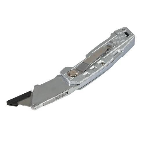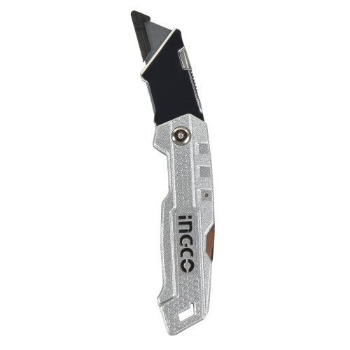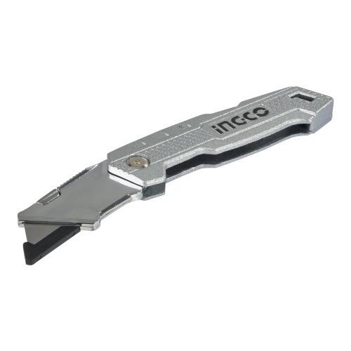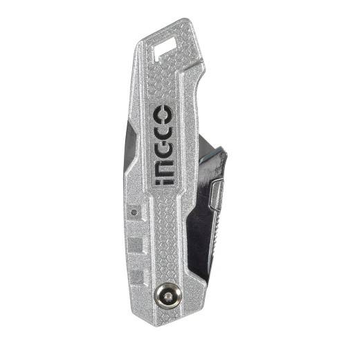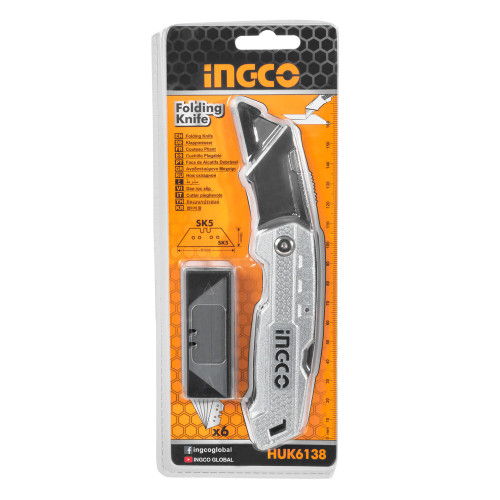 Ніж складаний алюмінієвий, 5 лез трапеція SK5 INGCO – це універсальний інструмент, що має широку сферу застосування. З його допомогою можна швидко та акуратно розрізати такі матеріали, як лінолеум, картон, шпалери та ін. Лезо виготовлене з вуглецевої сталі SK5. Матеріал корпусу — із цинкового сплаву, який забезпечує ніж захист від різних механічних впливів та, як наслідок, гарантує тривалий робочий ресурс. Є можливість проміжного закріплення леза. У комплекті 5 лез.