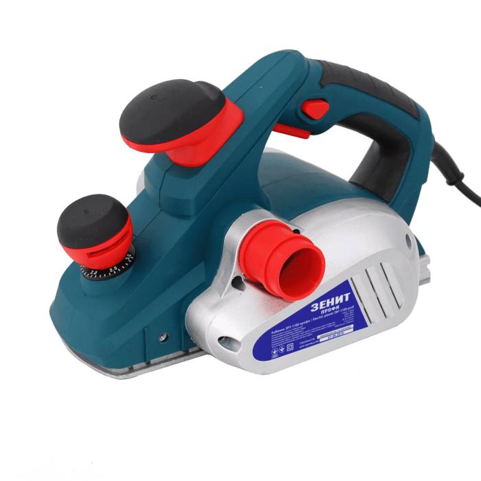 Рубанок ручний електричний ЗЕНИТ ЗРУ-1100 Профи – це надійний інструмент для стругання пиломатеріалів з деревини різних порід із можливістю ступінчатого регулювання глибини стругання до 3 мм, а також для зняття фасок і вибірки фальца ('чверті') до 12 мм при виконанні столярних робіт і виробництві дерев'яних конструкцій у побутових умовах. Поєднує в собі безліч сучасних конструктивних рішень для збільшення ресурсу роботи і продуктивності, а також для його безпечного використання: додаткову опорну рукоятку з гумовими накладками, посилений сплав опорної платформи, систему для попередження пошкоджень ножів після заточування, систему відводу стружки.