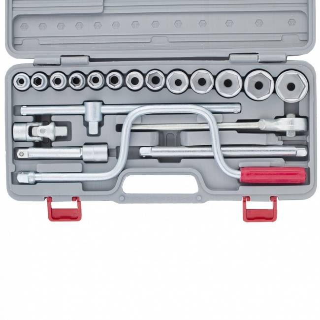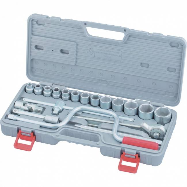 Всі інструменти виготовлені з інструментальної сталі 40Х і оцинковані. У комплект входять: ключ-тріскачка, ключ з приєднувальним квадратом, подовжувачі 125 і 150 мм, коловорот, шарнір, торцеві головки 10, 11, 12, 13, 14, 15, 17, 19, 22, 24, 27, 30 і 32 мм.