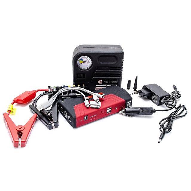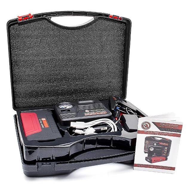 Набір пускозарядний пристрій та автомобільний компресор INTERTOOL AT-3010 зможе стати постійним помічником, як затятому автомобілісту, так і будь-якій людині, що веде активний спосіб життя! За допомогою цього пускозарядного пристрою можна здійснювати запуск двигуна за відсутнього або замерзлого основного акумулятора. Крім того, воно оснащене електричними виходами, за допомогою яких можна заряджати більшість поширених мобільних пристроїв і ноутбуків. Для цього в ньому передбачено два USB виходи (5В/2А) та регульований вихід з кількома положеннями: (12В/2А, 16В/3,5А, 19В/3,5А). До того ж вам не доведеться докуповувати жодних додаткових перехідників та адаптерів, тому що в базову комплектацію вже включені USB-адаптер із перехідниками для IPhone, IPad та пристроїв з роз'ємами mini- та micro-USB. А в корпус пристрою вмонтовано екстрений молоток, ніж та яскраві LED ліхтарики для освітлення (біле світло) та подачі екстреного сигналу (червоний та синій). А зарядка акумулятора самого пристрою можлива як від побутової мережі 220В, так і від прикурювача автомобіля, для чого в комплекті поставляється два зарядні пристрої для будь-якого з цих випадків. Завдяки цим особливостям та малій вазі пристрою (всього 415 грам) з невеликими габаритами (165х79х40) пускозарядний пристрій INTERTOOL AT-3010 буде корисним у туристичних походах та тривалих переїздах, де його можна буде використовувати як підзарядку для ваших мобільних пристроїв. Купити пускозарядний пристрій INTERTOOL AT-3010 стоїть ще й через компресор, що йде в комплекті. Маючи також компактний розмір (164х54х124) та невелику вагу (448 грам) він теж стане вірним помічником у дорозі. Його робочий тиск до 4 бар дозволить здійснювати підкачування коліс автомобілів, мотоциклів і велосипедів, а набір перехідників, що поставляється в комплекті, дозволить накачувати навіть матраци, кола та інші надувні вироби. У базовий комплект поставки входять: -Пускозарядний пристрій -Автомобільний міні компресор -Затискні клеми для під'єднання до автомобільного акумулятора -Зарядний пристрій від мережі 220В -Зарядний пристрій від прикурювача -USB-адаптер з перехідниками під роз'єми mini-USB, micro-USB, IPhone, IPad -Перехідник з комплектом насадок для заряджання ноутбуків -Комплект перехідників для компресора Весь набір поставляється кейсе з ударостійкого пластику для зручності зберігання та транспортування.