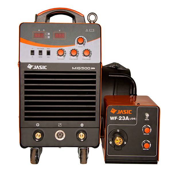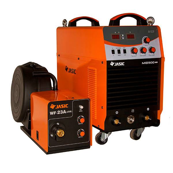 Jasic MIG-500 (N308) - це професійний зварювальний інвертор, який може використовуватися для напівавтоматичного зварювання в середовищі захисних газів (MIG / MAG), а також для ручного дугового зварювання (MMA). Апарат працює як дротом суцільного перетину, так і порошковим (потрібна заміна роликів механізму).