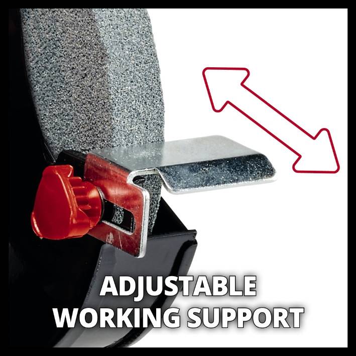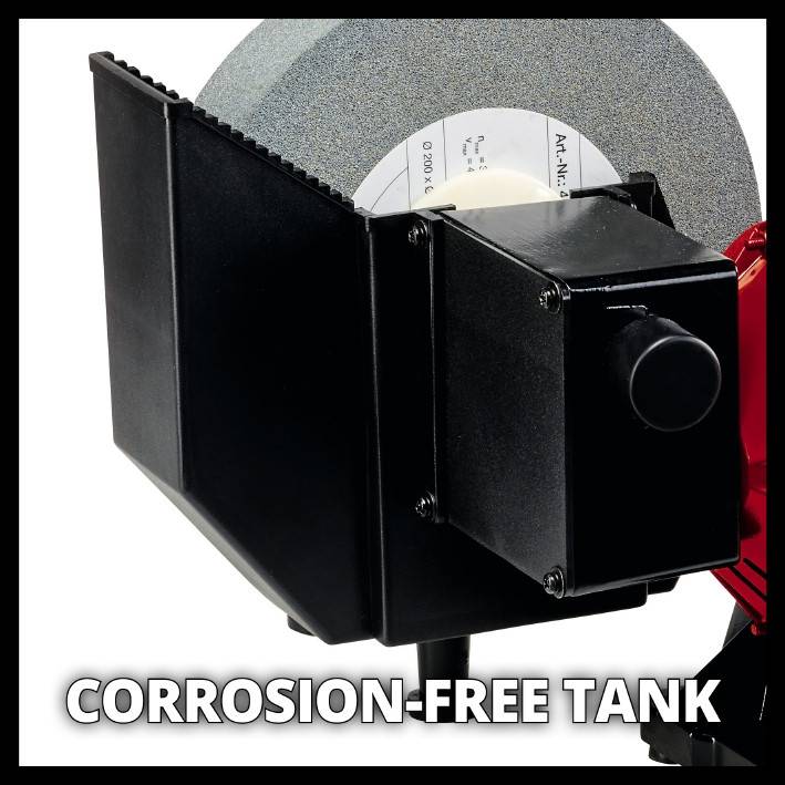 Точильний верстат Einhell TC-WD 200/150 для вологого та сухого шліфування є незамінним помічником для всіх робіт по вологій і сухій шліфовці, наприклад, заточування ножів і лез. Цей шліфувальний верстат оснащений одним грубим шліфувальним кругом і одним дрібнозернистим шліфувальним кругом, що повільно обертається, кожен з яких встановлено на шарикопідшипниковий вал. TC-WD 200/150 виготовлений в міцному, компактному корпусі з металу для тривалого терміну служби і надійно закріплений на чотирьох нековзних, вібропоглинаючих ніжках. Регульований робочий упор легко регулюється для грубого шліфувального круга. Для вологого шліфування існує корозійностійкий нержавіючий резервуар для води. Для забезпечення безпеки під час шліфування передбачений регульований іскрозахисний екран і закриті з боків захисні кожухи.