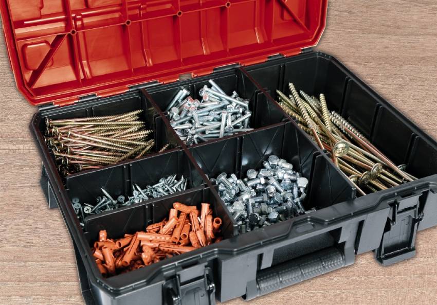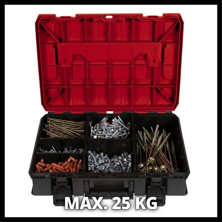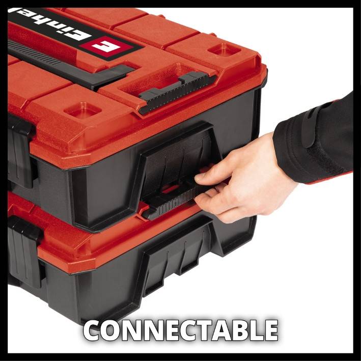 Практичний системний кейс для зберігання і транспортування інструментів+аксесуарів Система фіксації для з'єднання кейсів один з одним забезпечує надійне зберігання і транспортування Максимальна гнучкість при зберіганні аксесуарів, таких як гвинти, завдяки вбудованим пластиковим відділенням Захист від бризок для безпечного зберігання та транспортування Високоякісний пластик забезпечує термостійкість, жорсткість та ударостійкість Простий у використанні, оскільки можливе відкриття складених кейсів 2 складні ергономічні ручки для зручного перенесення Кейс Einhell E-Case S-C ідеально підходить для зберігання та транспортування інструментів та різноманітних аксесуарів, таких як свердла або гвинти. Для ще кращої організації системи разом із виробом поставляються 2 довгі та 3 середні пластикові відділення. Практична система фіксації для з'єднання складених кейсів разом гарантує, що все можна організовано і систематично зберігати та легко транспортувати складені кейси, а також можна відкривати у складеному вигляді. Корпус виготовлений з високоякісного пластику, захищений від бризок, а також є термостійким та ударостійким завдяки високоякісному матеріалу. Для оптимального комфорту при транспортуванні є дві складні ергономічні ручки. Можна встановити навісний замок.