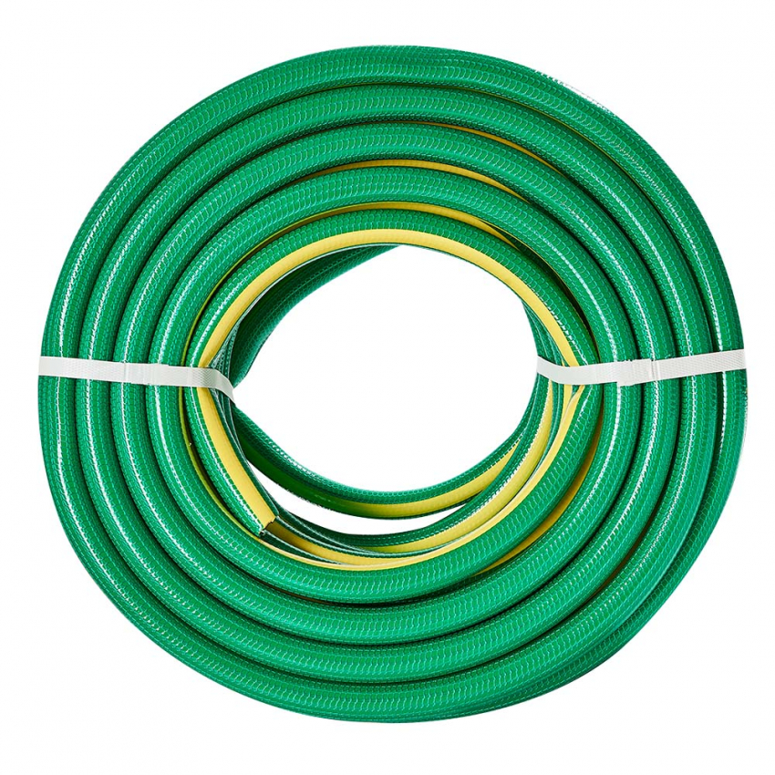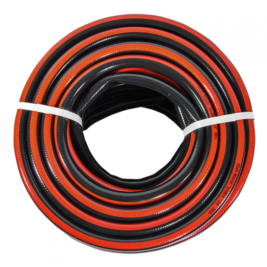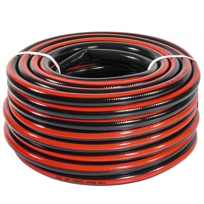 Шланг садовий для поливу Vitals Master 'Quattro' - це високоякісний та зручний шланг для поливу саду, городу, газону чи клумб. Шланг має діаметр ¾' і довжину 30 м, що дозволяє охопити велику площу поливу. Шланг виготовлений з полівінілхлориду (ПВХ), який має високу міцність, еластичність і стійкість до впливу води, ультрафіолетового випромінювання та наростання водоростей. Шланг має чотири шари. Прозорий зовнішній шар виконує роль захисту шлангу від механічних пошкоджень та стирання. Сітчасте обплетення з міцної синтетичної нитки, що становить проміжний шар, робить шланг стійким до розтягування та розривів. Третій шар додатково збільшує загальну товщину шланга та його здатність зберігати форму під час експлуатації та зберігання. Внутрішній шар із гладкою стінкою не створює перешкод потоку рідини усередині шланга. Шланг має робочий тиск 20 бар та тиск на розрив 25 бар, що гарантує безпеку та довговічність роботи. Шланг має робочу температуру від – 5 °С до + 45 °С, що дозволяє використовувати його в різних кліматичних умовах.