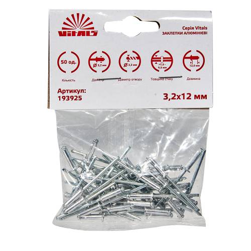 Використовуються для нерозбірного скріплення різних матеріалів за допомогою механічних або пневматичних заклепочників. Заклепки виготовлені з алюмінію, який має високу міцність, легкість і корозійну стійкість. Заклепки мають діаметр 3.2 мм та довжину 12 мм, що підходить для скріплення товщини від 7.5 до 9.5 мм. Рекомендований діаметр свердла для заклепки становить 3.3 мм. Заклепки постачаються в упаковці по 50 одиниць.