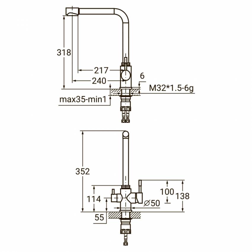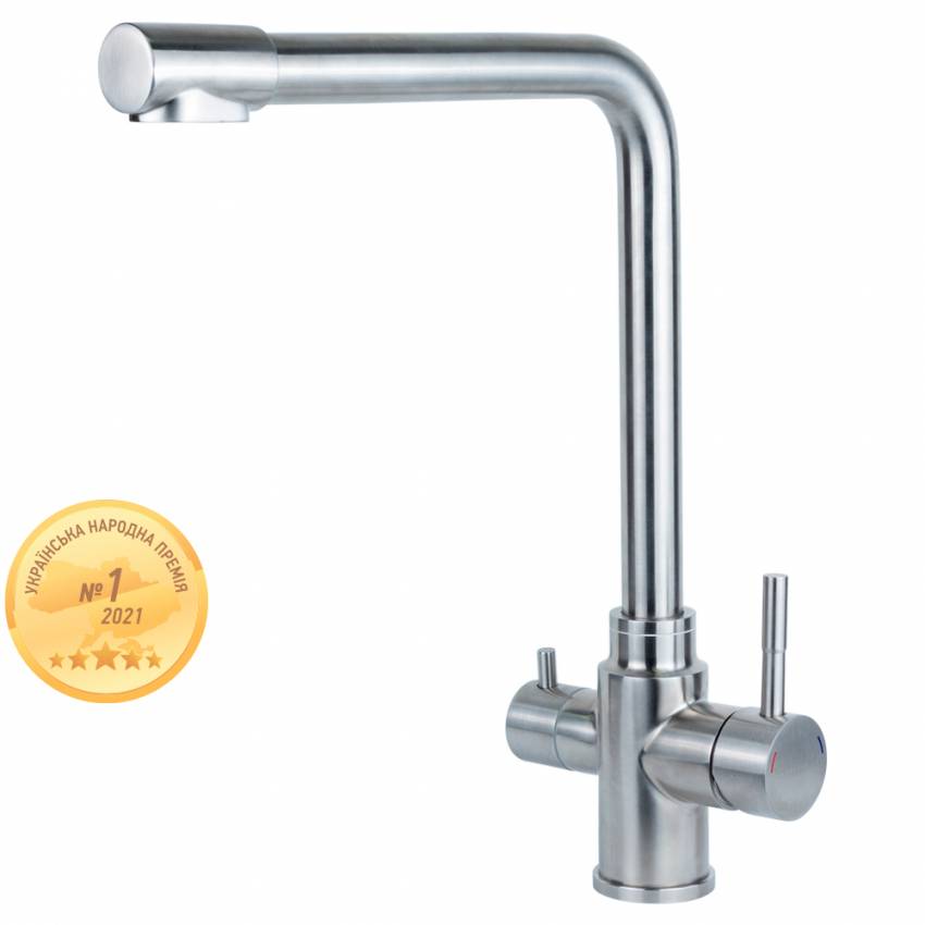 Змішувач KT Ø35 для кухні гусей з виходом для питної води на гайці SS AQUATICA (KT-4B770P) Мінімальний тиск у системі водопостачання: 0.5 бар Максимальний тиск у системі водопостачання: 10 бар Водневий показник води (pH): 6.5-8.5 Загальна мінер не більше 1500 г/м³ Тільки для чистої води без домішок, що містять абразиви (пісок, глину, вапно тощо) Комплектація: Гнучке підведення 1/2' × M10 × 400 мм - 2шт; Гнучке підведення для підключення фільтрованої води 7/16' × M10 × 350 мм - 1шт; Ключ для аератора – 2шт. Одноважільний змішувач для кухні (модель KT-4B770P) – це чудове рішення для любителів питної води із системою фільтрації, підключеної до водопроводу. Він стане незамінним помічником для кожного члена сім'ї, адже відрізняється зручністю експлуатації та багатофункціональністю. Корпус виконаний із нержавіючої сталі AISI304, яка зберігає презентабельний зовнішній вигляд протягом довгих років роботи. Виливши високий, Г-подібної форми з функцією аерації, яка збагачує потік води повітрям і знижує її витрату на 10-15%. Завдяки одноважільного управління з вбудованим керамічним картриджем, регулювати тиск і температуру можна однією рукою. Змішувач для кухні KT-4B770P має ряд переваг: довговічність та безвідмовність; елегантний дизайн; застосування якісних матеріалів; сучасні технології виробництва; 36 місяців гарантії. Комплектація: гнучкі підводи для підключення до магістралі та фільтрів, ключі для аератора.