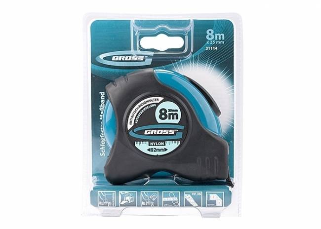 Рулетка Schlagfest торгової марки GROSS відноситься до кишенькових рулеток з автоматичною фіксацією вимірювального полотна. Використовується для вимірювань відстаней до 8 м.