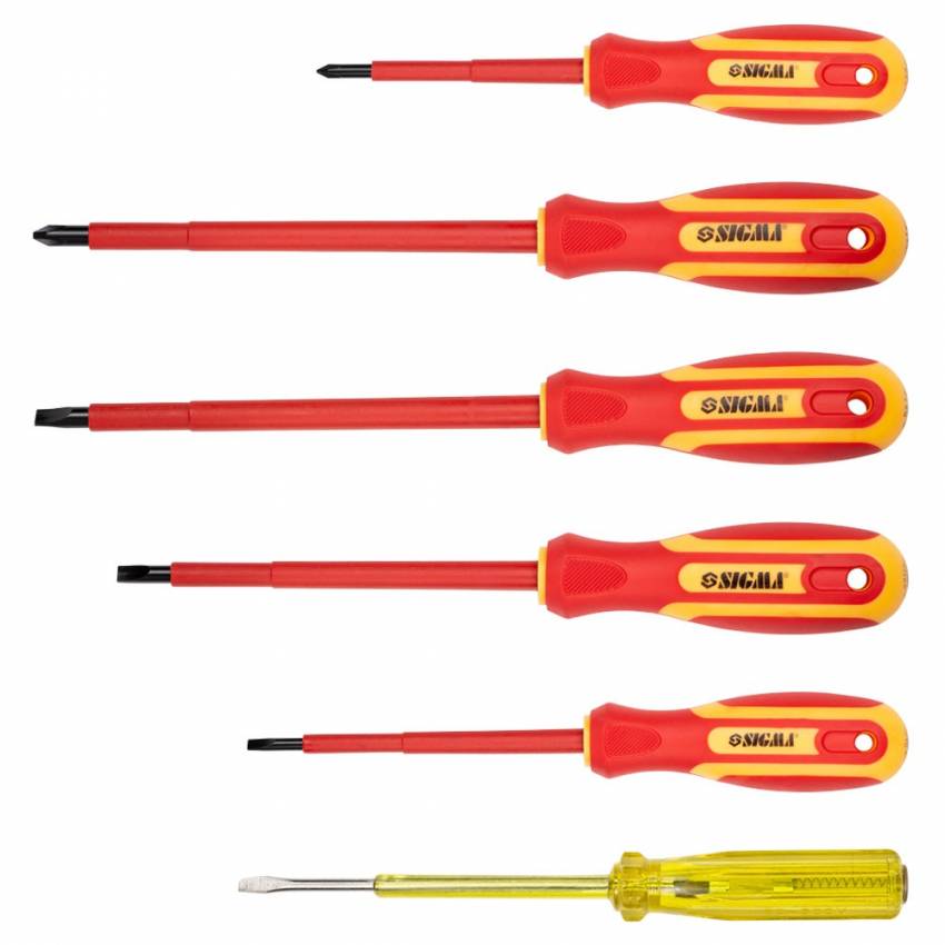 Набір викруток діелектричних 5шт. Жало викруток покрито ізоляційним матеріалом. У комплект входить 5 викруток для роботи з високовольтними мережами та 1 низьковольтний тестер для побутових мереж. Особливості: Crv сталь; Високовольтні (до 1000В). 6 предметів: PH1x80мм, РН2х150мм; SL6x150мм, SL5х125мм, SL4х100мм; Фазомер SL4х75мм, 250В. Купити набір викруток діелектричних Sigma Ви можете, оформивши замовлення у нашому інтернет-магазині за допомогою простої форми, доставка здійснюється по всій Україні. Якщо у Вас виникли запитання, Ви можете зателефонувати за вказаними номерами або замовити зворотній дзвінок. Спеціалісти нашого інтернет-магазину нададуть Вам детальні консультації та допоможуть зробити правильний вибір.