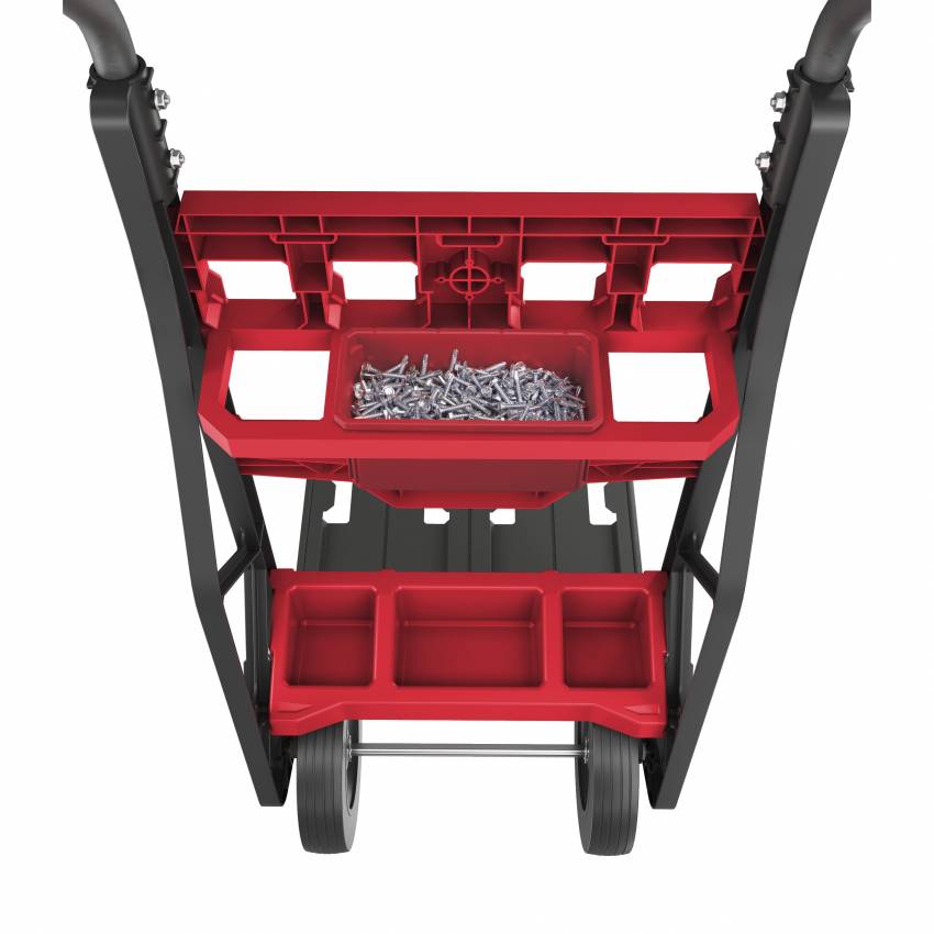 2 місця кріплення елементів системи PACKOUT™ для додаткової зручності. Вбудовані місця для розміщення довгих інструментів, наприклад рівнів. Вантажопідйомність 180 кг. Колеса діаметром 25 см розміщені таким чином, щоб проходити у дверні отвори. Складна нижня опора для зручності зберігання. Частина модульної системи зберігання PACKOUT™. Виготовлена з ударостійкого полімеру для надійності в умовах будівельного майданчика.