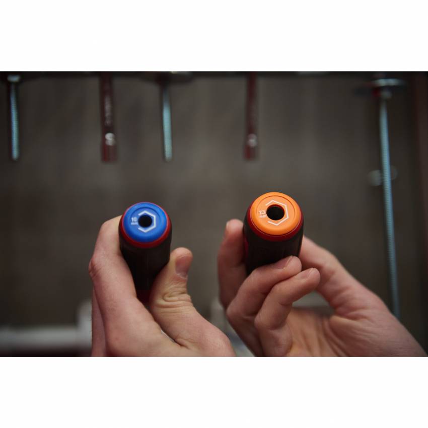 Hollowcore™ необмежена глибина для довгих болтів та шпильок (запатентовано). Магнітна головка викрутки для надійного утримання на кріпленні. СВІТОВА НОВИНКА Універсальна головка викрутки підходить до 4 видів кріплення: 4/6/8/12 гранним гайкам Відвертає іржаві та заокруглені гайки Колірна індикація дозволяє швидко підібрати інструмент під потрібну гайку Шестигранний стрижень дозволяє додати додаткове зусилля. Хромове покриття для захисту від іржі. Кований сталевий стрижень забезпечує довгий термін служби та міцність