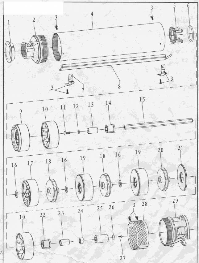 Насос відцентровий свердловинний 1.5кВт H 101(67)м Q 140(100)л/хв Ø102мм AQUATICA (DONGYIN) (777143) Насоси даної серії призначені для перекачування чистої води і можуть застосовуватися: установка кожуха охолодження), для перекачування води в резервуари, для зрошувальних систем, для автоматичної подачі води разом із невеликими резервуарами при використанні керуючої автоматики (керуючі реле, контролери тиску). Насосна частина: Корпус насосної частини: нержавіюча сталь AISI 304; Вихідний фланець: латунь; Вал насосної частини: нержавіюча сталь AISI 304; Муфта валу: нержавіюча сталь AISI 304; Робоче колесо: технополімер; Шайба фасонна роздільна: технополімер; Дифузор: технополімер. Електродвигун: Тип двигуна: асинхронний, маслонаповнений, з вбудованим в обмотку термозахистом; Обмотка статора: мідь; Корпус електродвигуна: нержавіюча сталь AISI 304; Вал двигуна: нержавіюча сталь; Механічне ущільнення: кераміка/графіт; Підшипник: кочення (C