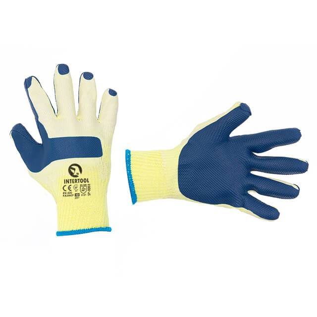 Модель рукавиць SP-0003 має подвійне латексне покриття синього кольору, який також нанесений з тильної сторони долоні для додаткового захисту кистей рук від пошкоджень.