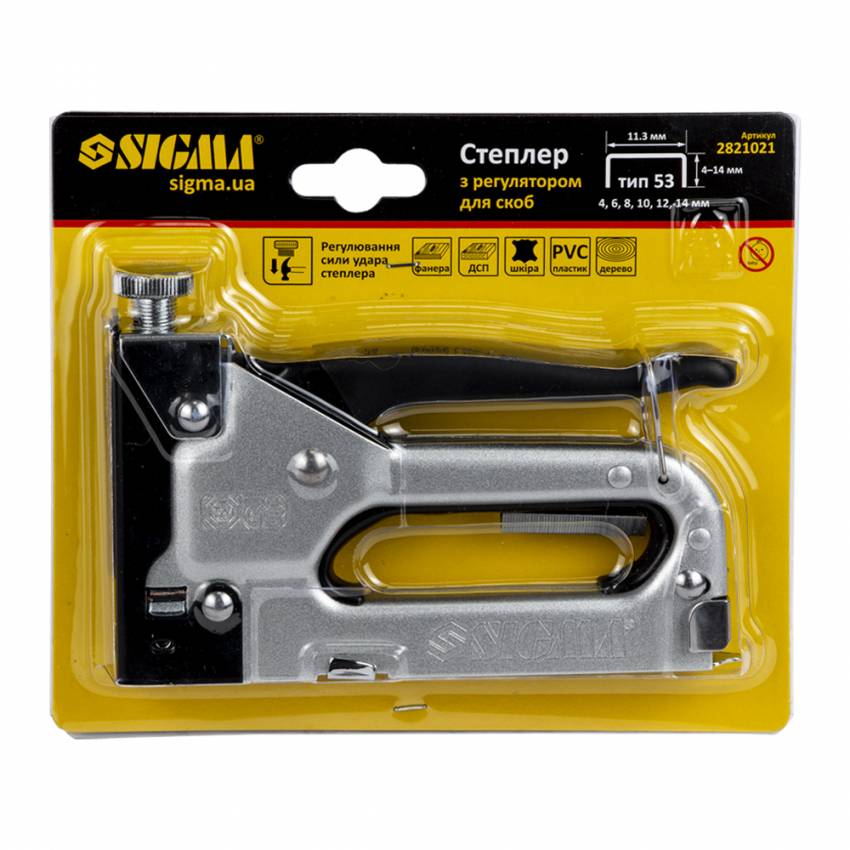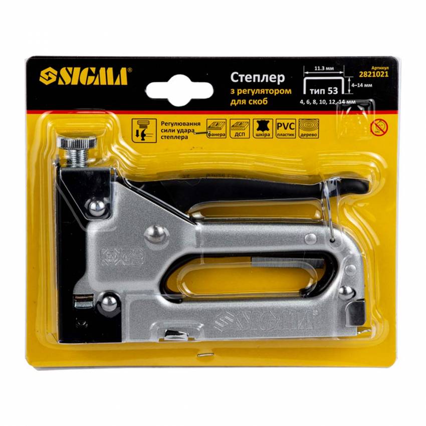 Степлер із регулятором для скоб 4-14мм хром Sigma (2821021) призначений для швидкого кріплення матеріалу (оргаліту, фанери, ДСП, ДВП, плівки, утеплювача) до основи. Незамінний при складанні меблів, укладанні килимового покриття, а також при фіксації утеплювача, обшивці м'яких меблів, багетних роботах. Особливості: Регулятор удару; Обгумована рукоятка. Купити степлер Sigma Ви можете, оформивши замовлення у нашому інтернет-магазині за допомогою простої форми, доставка здійснюється по всій Україні. Якщо у Вас виникли запитання, Ви можете зателефонувати за вказаними номерами або замовити зворотній дзвінок. Спеціалісти нашого інтернет-магазину нададуть Вам детальні консультації та допоможуть зробити правильний вибір.