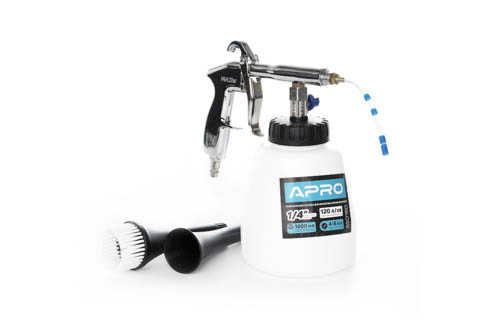 Код: 065505; Длина: 195; Ширина: 135; Высота: 225; Упаковка: 20; Страна: Китай; Вес: 0.72; Напрямок обертання: 5; Найменування для ІМ Укр: Пневмопістолет для химчистки салонів автомобілів 1000мл (торнадор) APRO; Об'єм бака: 1000 мл; Пневматичне з'єднання: 1/4“; Робочий тиск: 4-6 Бар; Витрата повітря: 120 л/хв;