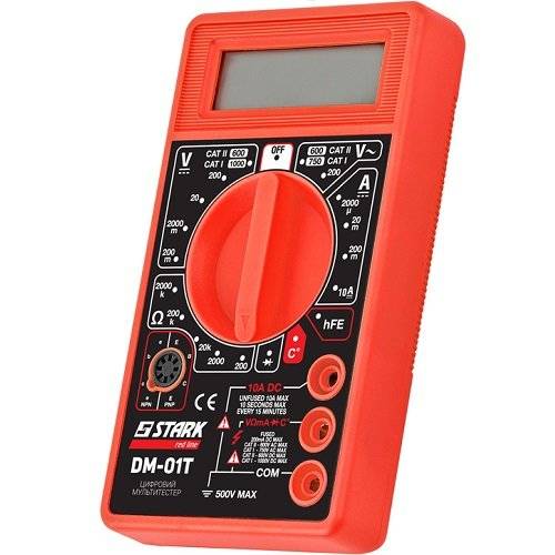 Stark DM-01T – цифровий мультитестер для вимірювання змінного та постійного струму, для тесту з функцією продзвону, вимірювання температури та ін. Обладнаний великим дисплеєм, завдяки якому легко зчитувати дані вимірювання. Легке перемикання між функціями забезпечує регулювальне колесо. Основні функції цифрового детектора Stark DM-01T: Вимірювання постійної напруги: 200 m-2000 m, 20 V, 200V, 1000V…/- (0.5% 2dtg); Вимірювання змінної напруги: 200V; 750V…/-(1.2% 10dtg); Вимірювання температури: 0 ° -1000 С °; Вимірювання опору діода: 200?,2000?,20K?,200K?,2000k?...(0.8% 2dgt); Функція 'продзвону'; Можна вибирати діапазон вимірювань для точної роботи. Stark DM-01T – надійний вимірювальний інструмент для точної роботи при будівництві, електромонтажі, ремонті та ін.