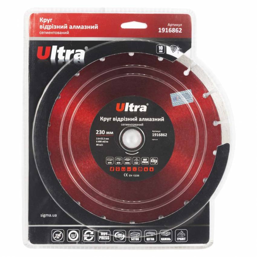 <b>Круг відрізний алмазний сегментований Ø230×22.2мм ULTRA (1916862)</b> призначений для різання бетону, граніту, цегли, каменю, черепиці, асфальту та інших будівельних матеріалів без примусового охолодження. Корпус виготовлений із міцної сталі, здатної витримати значні механічні навантаження ти високу температуру. Добре збалансована основа зменшує вібрацію на інструмент та забезпечує високу надійність під час експлуатації.