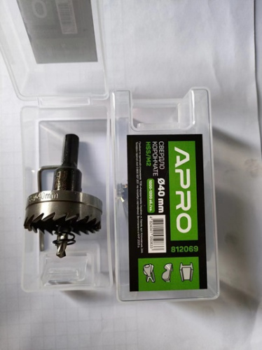 Код: 081337; Длина: 100; Ширина: 50; Высота: 50; Упаковка: 100; Страна: Китай; Вес: 0.15; Найменування для ІМ Укр: Сверло корончатое HSS/М2 Ø40мм APRO;