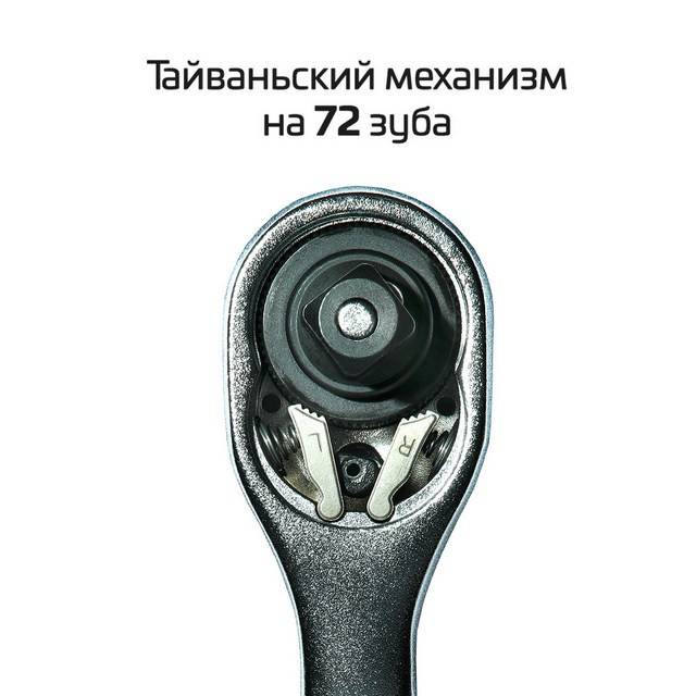 Тріскачка повністю виготовлена з Сr-V сталі, яка гарантує виняткову міцність та стійкість до зносу. Храповий механізм вироблено в Тайвані, відрізняється надійністю та плавністю ходу, 72 зуби з дрібним кроком забезпечує високий крутний момент. До того ж тріскачка вкрита двома шарами нікелю, які захищають від окислення та корозії.