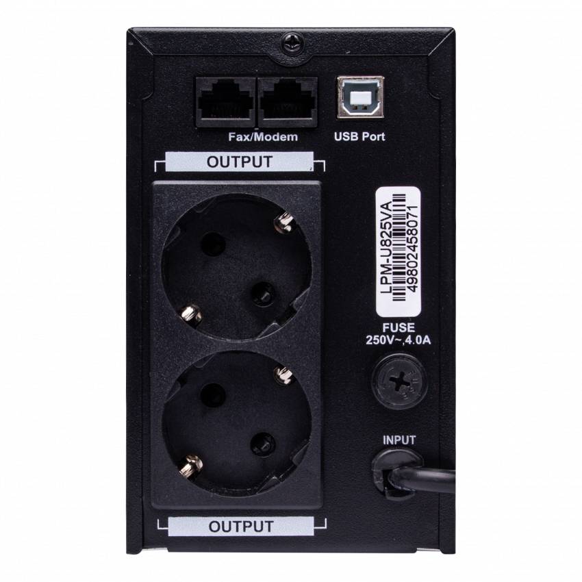 Лінійно-інтерактивне джерело безперебійного живлення LPM-U825VA застосовується для стабілізації напруги в мережі живлення електричним струмом побутової, офісної або промислової техніки. Тип - лінійно-інтерактивне джерело безперебійного живлення з апроксимованою синусоїдою. Підходить для під'єднання до кухонної або побутової техніки, телевізійного або звукового обладнання (у тому числі пристрої охоронного відеоспостереження), а так само до освітлювальних приладів. Споживана потужність - 825VA/577W. ДБЖ LPM-U825VA підтримує роботу електричних приладів (від акумуляторної батареї) упродовж - 10-15 хвилин. Час перемикання в автономний режим - 4-6 мс. ДБЖ LPM-U825VA стабілізує вхідну напругу в мережі у діапазоні 145-290V до величини вихідної напруги - 220V±10%. Частотний діапазон - 50/60 Hz. Матеріал виготовлення корпусу - метал. Колір корпусу - чорний. Тип підключення до мережі - євровилка. Для підключення електричних приладів зовнішня сторона корпусу ДБЖ LPM-U825VA обладнана 2 розетками європейського типу. Інтерфейс підключення до персонального комп'ютера - USB. Із зовнішнього боку корпусу, розташована світлова LED індикація, яка показує в якому режимі працює прилад (від мережі або від акумулятора). Габаритні розміри - 308х85х139 мм. Вага - 5.6 кг.