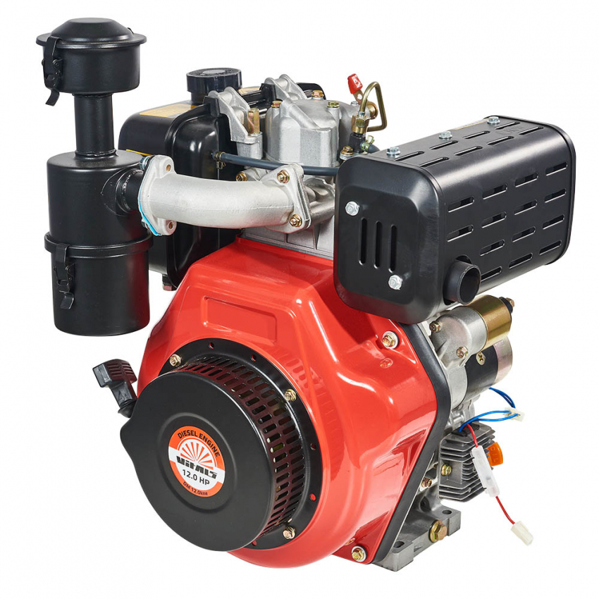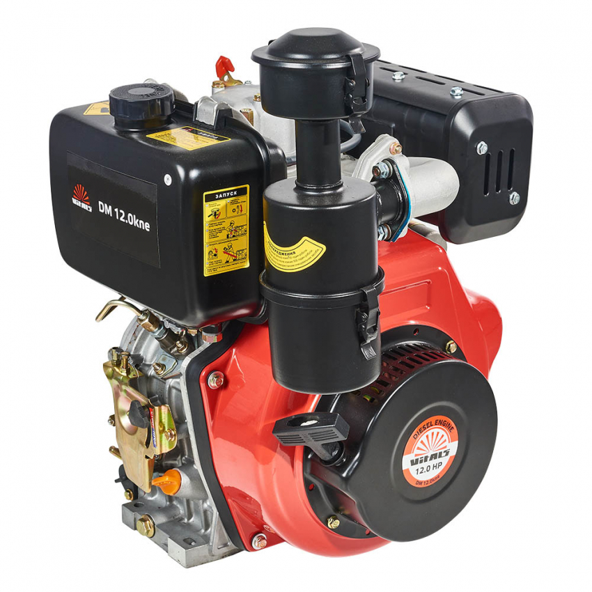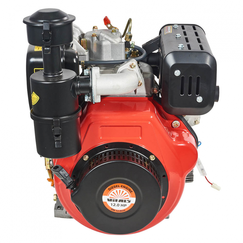 Опис двигуна дизельного Vitals DM 12.0kneДизельні двигуни внутрішнього згоряння Vitals DM 12.0kne є універсальними одноциліндровими чотиритактними двигунами з повітряним охолодженням загального призначення. Двигуни Vitals DM 12.0kne потужністю 12 л. с., робочим об'ємом 477 см3 і шпонковою сполучною частиною валу застосовуються як автономні силові агрегати для широкого спектру техніки, обладнання, верстатів і транспортних механізмів. Дані двигуни використовуються там, де необхідна висока потужність, надійність та невибагливість в експлуатації, у складі: міні-електростанцій; у сільськогосподарській техніці - мотоблоках, мотокультиваторах, косарках, самохідних шасі, іригаційних та зрошувальних системах та ін; у будівельному обладнанні — у віброплитах, вібротрамбовках, бетонозмішувачах, компресорах, насосах та помпах. Також двигуни DM 12.0kne можна використовувати в транспортних засобах, у тому числі для водного транспорту — човнів, катерів і невеликих яхт. Полегшує та здешевлює ремонт. Для запуску дизельних двигунів DM 12.0kne використовується ручний та електричний стартер. Двигуни обладнані декомпресійним клапаном, що значно полегшує запуск будь-якої пори року. Щоб уникнути травм у процесі роботи, у двигунах DM 12.0kne передбачений аварійний вимикач для зупинки двигуна у разі небезпеки. Для полегшення доступу з різних боків картера передбачено дві горловини для заливки олії із пробками-щупами.