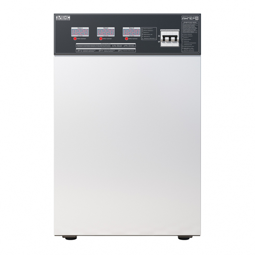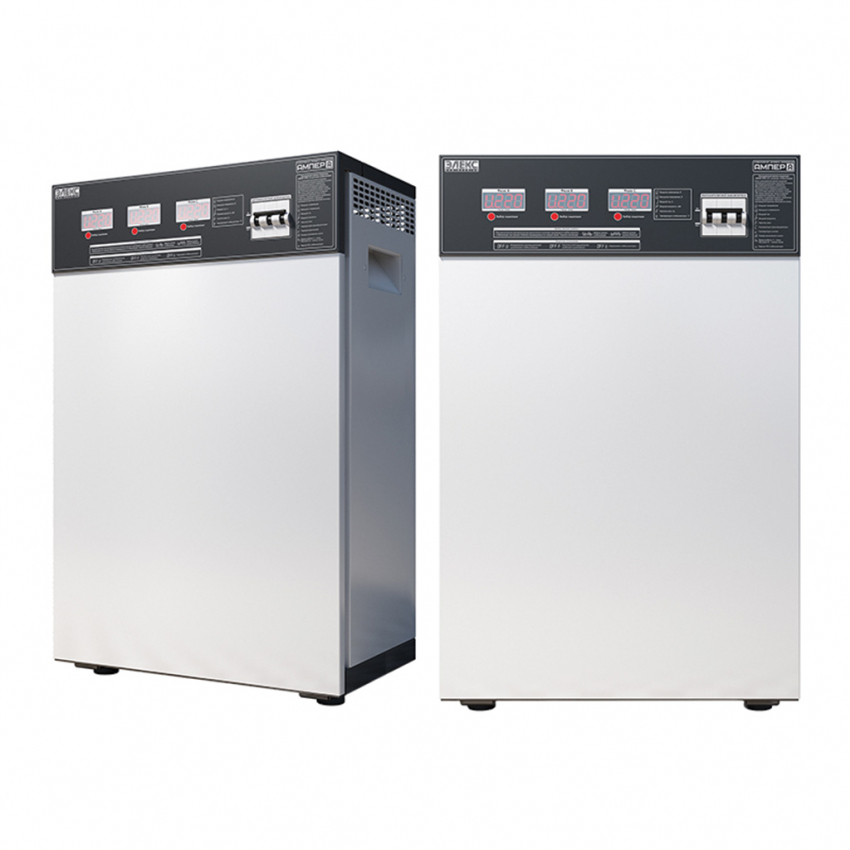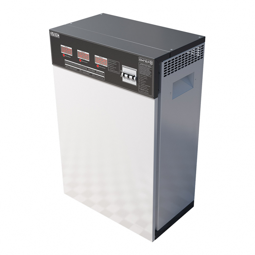 Трифазний стабілізатор напруги Ампер У 12-3/25 v2.0 призначений для роботи у трифазних електричних мережах з коливаннями напруги від 145 до 275В. У цьому діапазоні апарат гарантовано видає на виході напругу в межах 220±3,5%, що забезпечується за рахунок використання 12 ступенів стабілізації. Загальна номінальна потужність цієї моделі 16.5 кВт (5.5 кВт на фазу), що відповідає робочому струму автоматичного вимикача 25А на ньому.