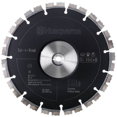 Husqvarna EL 35CnB – алмазний диск для різання бетону, армованого бетону, граніту, цегли за допомогою бензинового та електричного різьбяра. Підходить також для розрізу мармуру, природного каменю та абразиву. Сегментний різальний диск робить розріз твердих будівельних матеріалів легшим, з меншим тертям та кращим охолодженням. Діаметр диска 230 мм може здійснювати різ у глибину до 400 мм. Алмазний шов прикріплений за допомогою лазерного зварювання, завдяки чому легко робить різ на великій швидкості. Диск Husqvarna EL 35CnB працює з вологою різкою, що забезпечує диску тривалий термін експлуатації.