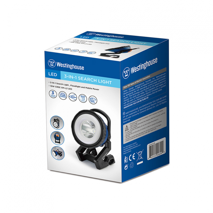 Багатофункціональний освітлювальний виріб 3-в-1 Westinghouse WF1537-4500mAh живиться вбудованим літій-іонним акумулятором 26650/4500мAгод, що розрахований на 1000 циклів перезарядження, забезпечуючи чудове та довготривале освітлення у якості точкового прожектора, прожектора заливаючого світла, чи сигнальної лампи бурштинового світла, для використання у скрутному становищі. Енергозберігаючий CREE-світлодіод 10Вт та 30-ть SMD3528 світлодіодів забезпечують надзвичайну продуктивність в режимі спрямованого світла у 700 люмен і заливаючого світла у 100 люмен, а лінза дозволяє ліхтарю працювати як точковий прожектор.