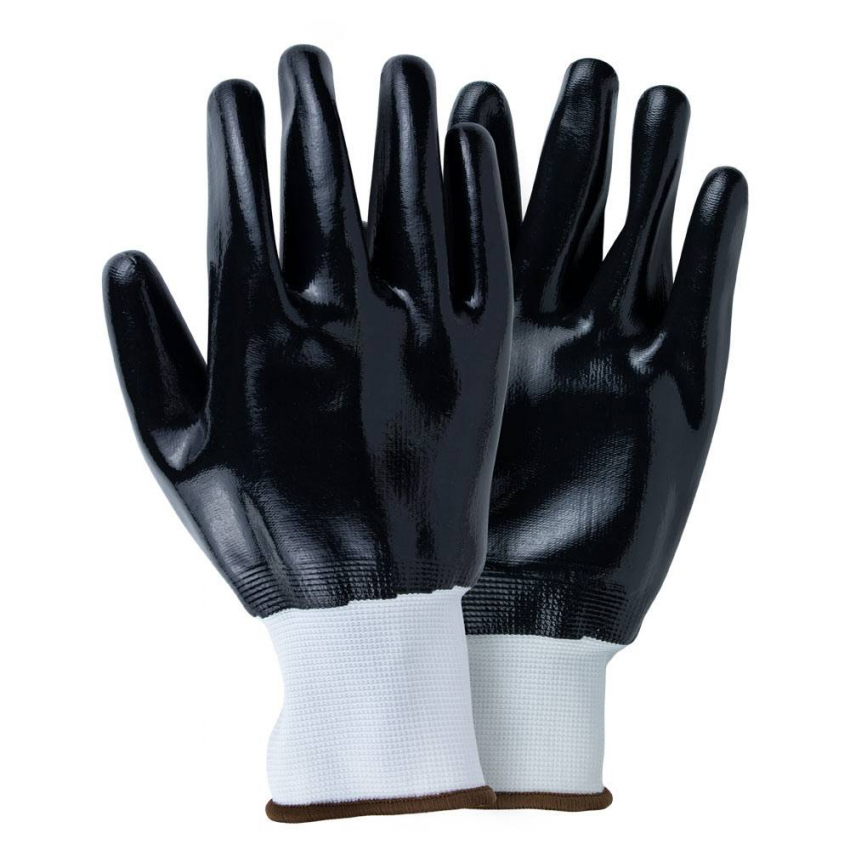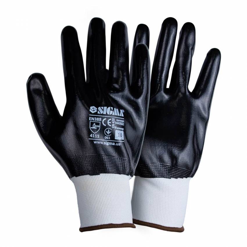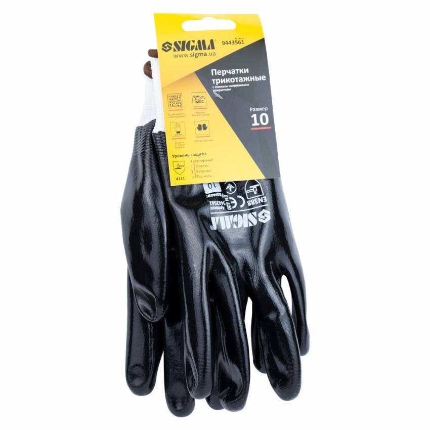 <b>Рукавички трикотажні з повним нітриловим покриттям р10 (чорні манжет) SIGMA (9443561)</b> призначені для захисту від механічних впливів, жиру і масла. Оптимально підходять для робіт, де необхідна висока точність. Завдяки довговічності нітрилового покриття особливої популярності рукавички придбали на СТО, шиномонтажних майстерень.