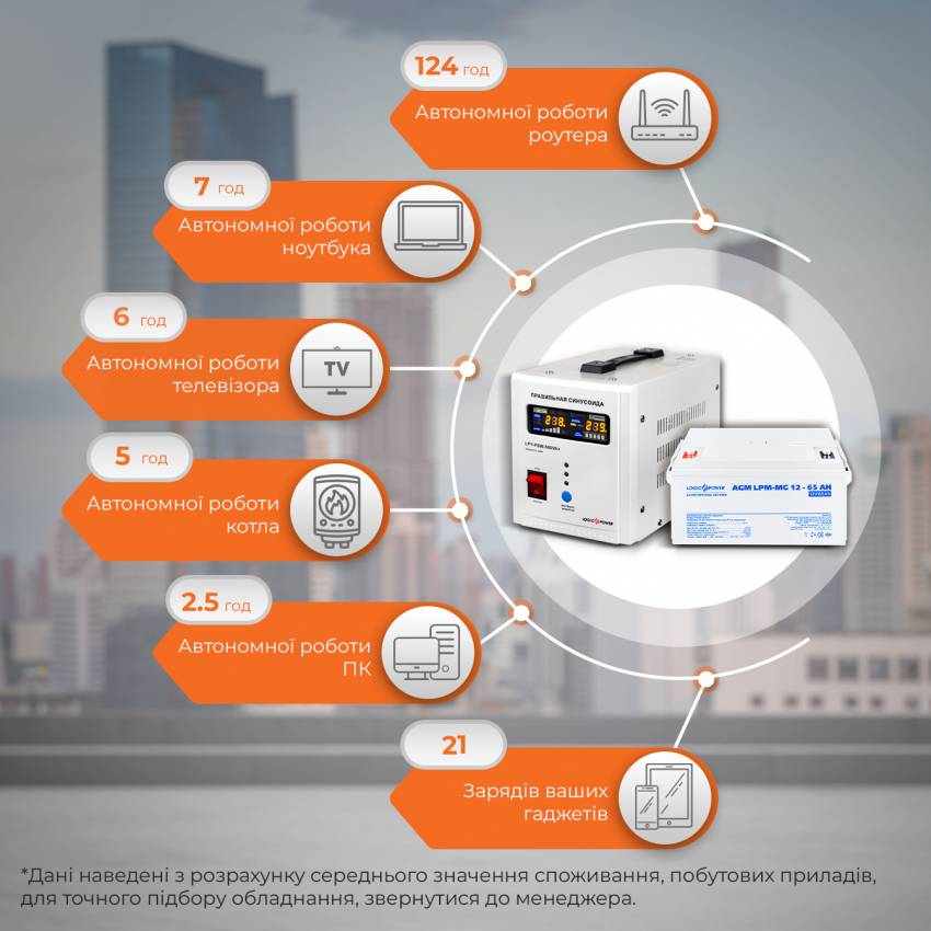 Комплект ДБЖ LPY-PSW-500VA+ Акумулятор LPM-MG 12V - 65 Ah спеціально підібраний для забезпечення безперебійного живлення електричних газових котлів, систем відеоспостереження, комп'ютерної техніки та інших електричних пристроїв, які працюють в режимі 24/7/365.