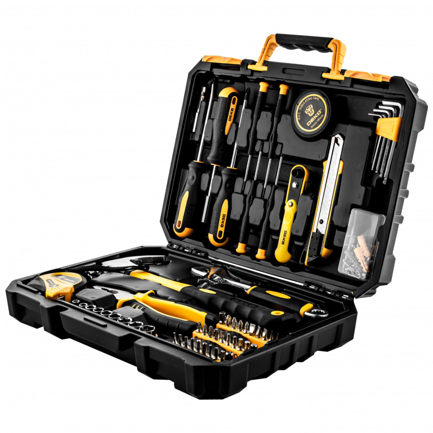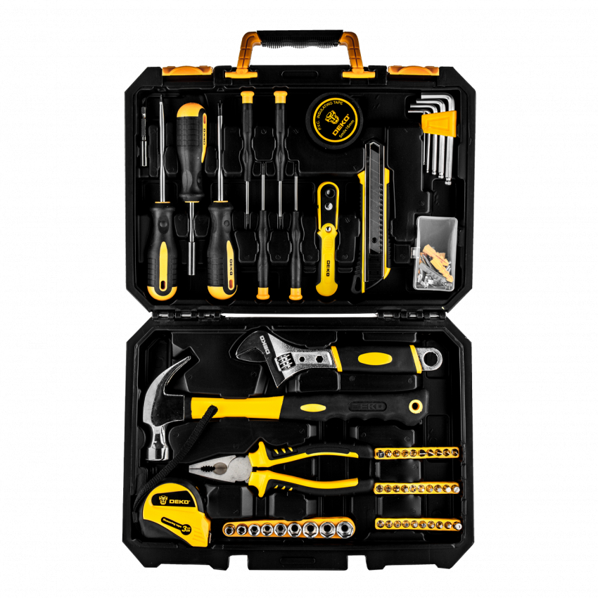 Набір інструментів DEKO включає все, що необхідно майстру для будівельних, ремонтних і монтажних робіт. Протиковзне покриття викруток забезпечує максимальний комфорт під час використання. Рукоятки інструменту мають гумове покриття.