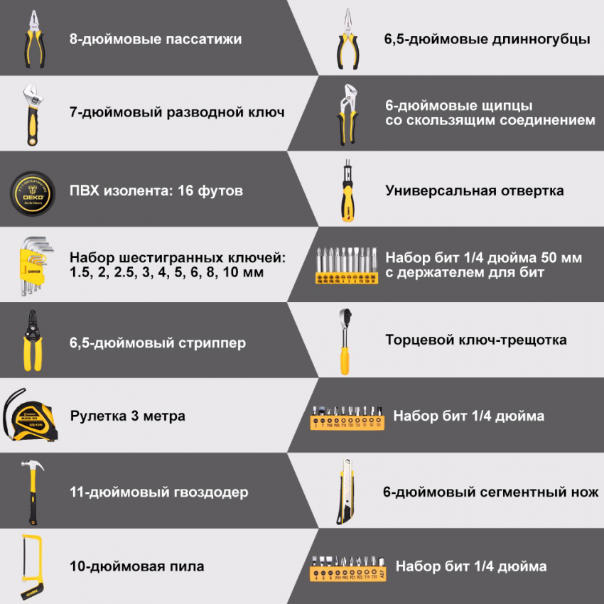 Набір інструментів DEKO включає все, що необхідно майстру для будівельних, ремонтних і монтажних робіт. Протиковзне покриття викруток забезпечує максимальний комфорт під час використання. Рукоятки інструменту мають гумове покриття.