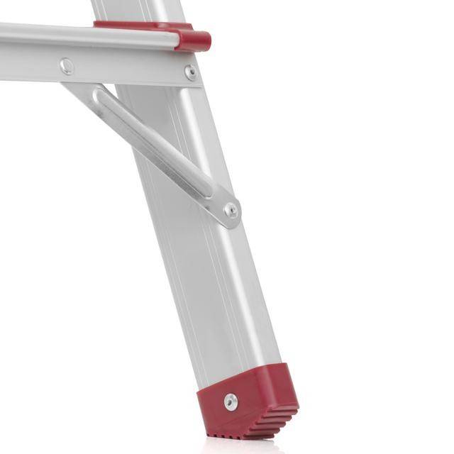 Протиковзні опорні наконечники міцно зчіплюються з поверхнями підлоги. Драбина стійко стоїть і ви можете не боятися впасти. А надійні шарніри та стяжні профілі безпеки з боків захищають від непередбаченого складання та розкладання драбини.
