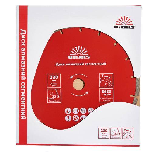 Алмазний диск Vitals сегментний 230х22.2х7 мм призначений для різання бетону, тротуарної плитки, цегли, граніту, каменю та черепиці. Швидкість різу збільшена за рахунок сегментних вирізів у структурі диска. При цьому диск не потребує примусового водяного охолодження. Ефективність роботи залежить від правильно підібраного діаметра диска: 125, 180 або 230 мм.