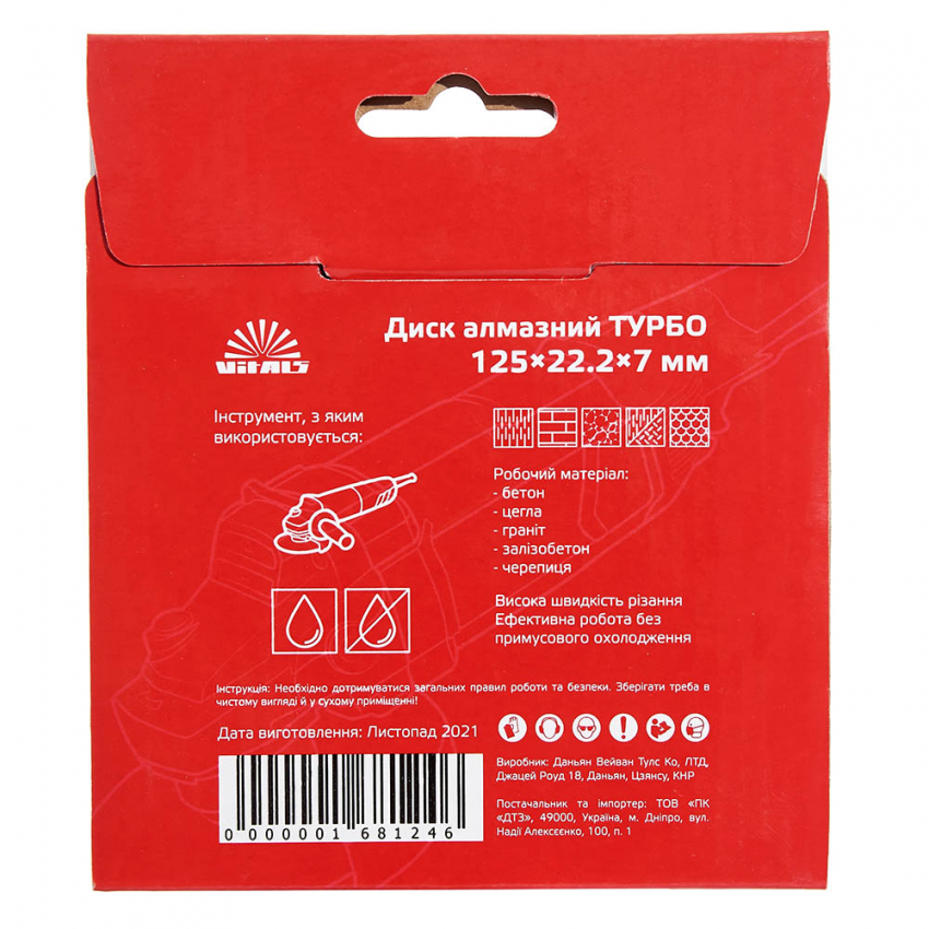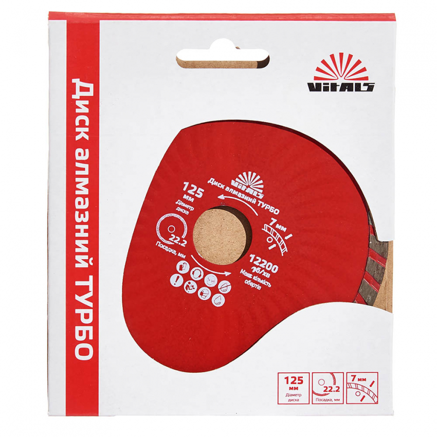 Алмазний диск Vitals ТУРБО 125х22.2х7 мм застосовується для різання бетону, цегли, граніту, залізобетону та черепиці. Диск має хвилеподібну кромку, завдяки якій має більше матеріалів, які здатні різати. Ріжучі грані у структурі диска під спрямовані під кутом, що підвищує його охолодження під час роботи. Ефективність роботи залежить від правильно підібраного діаметра диска: 125, 180 або 230 мм.