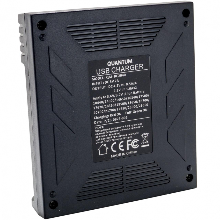 Зарядний пристрій Quantum QM-BC2040 для Li-ion 3.7V акум. 4-slot (USB) Зарядний пристрій Quantum QM-BC2040 використовує безпечну напругу постійного струму 5В для зарядки 4-х акумуляторів Li-ion 3.6/3.7В. Пристрій може живитися від зарядки для мобільного телефону, павербанка, вихідного порту USB 5В комп'ютера чи мережевого розгалужувача. Вхідний Type-C порт пристрою сучасний, зручний у використанні. Зарядний пристрій має вбудовану інтегральну схему яка може ефективно контролювати процес заряджання. Загалом пристрій оснащений п’ятьма захистами: від перезарядження, перевантаження по струму, короткого замикання, зворотного підключення, перерозрядження. Негативний електрод виконаний у вигляді ковзаючої пластини з прорізом довжиною 32-71 мм, що сумісно з різними типами циліндричних акумуляторних батарей. Значною перевагою зарядного пристрою QM-BC2040 є його компактні розміри - можна використовувати в дорозі під час подорожей та легко упакувати в рюкзак чи сумку. Технічні параметри Модель: QM-BC2040. Матеріал: ABS. Вхідна напруга: DC 5В 2A. Вихідна напруга: DC 4.2В 0.5Ax4; 1.0Aх2; 1.0Aх1. Зарядка: червоне увімкнене. Повний заряд: зелене увімкнене. Особливості: 4 слоти зарядки. Типи акумуляторів: 3.6В/3.7В Li-ion IMR/INR/ICR/NCR/NCM, типорозміри 10440 / 14500 /14650 / 16340 /17500 / 17670 / 18350 / 18500 / 18650 / 18700 / 20700 / 21700 / 22650 / 25500 / 26650. Розміри, мм: 96х108х28. Вага, г: 110. Використання При підключенні вхідного порту Type-C зарядного пристрою QM-BC2010 до виходу адаптера живлення USB DC 5В 2A, через кабель для зарядки, індикатор на зарядному пристрої загориться зеленим. Літій-іонний акумулятор 3.7В правильно вставте в гніздо для зарядки (зверніть увагу, що необхідно перевірити позитивну та негативну полярність батареї), а індикатор заряджання загориться червоним кольором, вказуючи на те, що пристрій знаходиться в стані заряджання. Коли батарея вставлена в гніздо невірно, якщо плюсова і негативна полярність батареї переплутана, індикатор на зарядному пристрої погасне і пристрій у цей час не працюватиме та акумулятор не буде заряджатися. Після правильного розміщення акумулятора індикатор зарядного пристрою загориться червоним, а коли акумулятор повністю заряджений - зеленим. Якщо встановлено пошкоджений акумулятор, індикатор зарядного пристрою може швидко змінитися з червоного на зелений, або залишиться зеленим. . Акумулятори типорозміром 26650 можна заряджати лише в 1-му та 4-му слотах. Після завершення заряджання вчасно вийміть акумулятор, відокремте зарядний пристрій від джерела живлення USB та упакуйте зарядний пристрій правильно для зберігання. Цей зарядний пристрій заряджає лише літій-іонні 3.6 / 3.7В акумулятори.