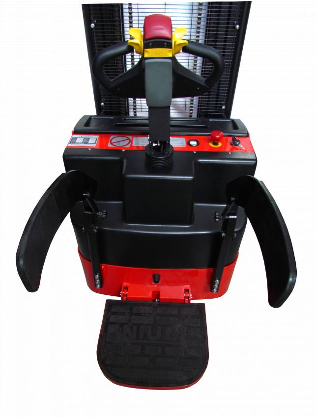 Електричний штабелер CTQN 1.5Т/4.0М має прогумовану площадку для оператора, яка захищена з двох сторін відкидними бортами безпеки та складається в сторону корпуса, це зручно та компактно під час зберігання. Площадка для оператора дає можливість відмінного огляду для оператора під час керування, для цієї мети спеціалісти змінили форму корпусу обладнання, зробивши її більш обтічною. Він маневровий та тихий під час роботи за рахунок міцних поліуретанових коліс, 4 спереду та 2 заді. Зовнішній радіус розвороту 1600 мм. Вила виготовлені з міцної зносостійкої сталі, мають довжину 1150мм та ширину 170мм. Штабелер працює на акумуляторі 24В ємністю 240Аг. Зарядний пристрій для АКБ іде в комплектації.