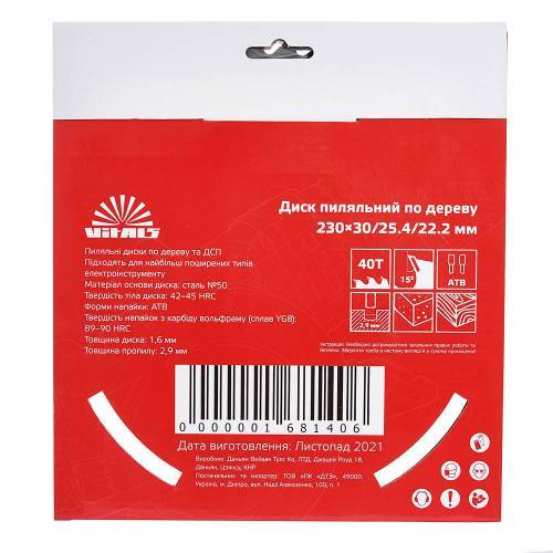 Пиляльний диск Vitals по дереву 230x30/25.4/22.2, ATB 40 підходить для поздовжнього та поперечного розпилу деревини - як м'якої, так і твердої породи, а також ДВП, ДСП.