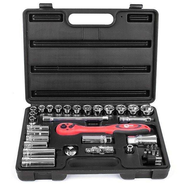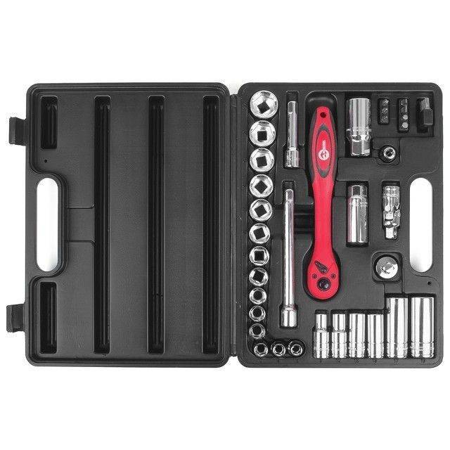 У комплекті вороток, подовжувачі, кардани - потрібні для відкручування гайок, болтів та шпильок у глибоких колодязях двигунів або в місцях, де складно їх дістати. Головка для зняття свічок запалювання (21 мм) дозволяє замінити свічки на автомобілі будь-якого виробника.