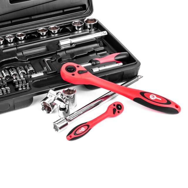 Механізм тріскачок має плавний хід у 72 зубці, вирізняється високою точністю та зносостійкістю. Швидке скидання головок та наявність реверсу спростять й прискорять роботу майстра. Вигнута форма ручки для зручної роботи у важкодоступних місцях. Головки надійно фіксуються на посадкових квадратах тріскачок, не спадають й щільно прилягають до поверхні кріплення. Тріскачки повністю вкриті захисним шаром поліпропілену з гумовою накладкою в місці хвату для кращої фіксації в руці, не ковзають та не випадають під час роботи.