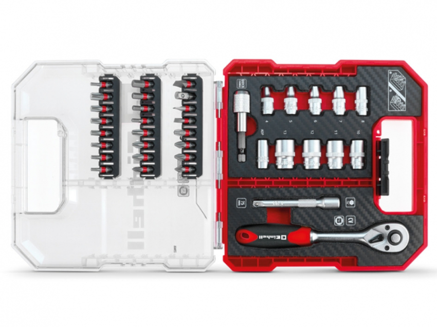 Набір аксесуарів L-CASE від Einhell, що складається з 37 предметів, — це повний набір інструментів, який сумісний з усіма поширеними свердлильними патронами та тримачами насадок у наявних у продажу акумуляторних викрутках і дрилях. Він містить різноманітні високоякісні інструменти, придатні для широкого спектру гвинтових і монтажних робіт. Набір Einhell містить 23 біти на 25 мм з хвостовиком C 6.3 розмірами T10 / T15 / T20 / T25 / T27 / T30 / T40 / H2.5 / H3 / H4 / H5 / H6 / PH1 / 2x PH2 / PH3 / PZ1 / 2x PZ2 / PZ3 / SL4 / SL5.5 / SL6.5. Біти виготовлені з міцної сірої сталі S2, обробленої піскоструминним струменем, і мають кольорове кільце. Швидкозмінний тримач насадок довжиною 60 мм із вуглецевої сталі з хвостовиком E 6.3, металевою втулкою та сильним магнітом забезпечує швидку та легку зміну біт. Крім того, набір біт і головок з тріскачкою включає 75-мм подовжувач для головок із міцної матової хромованої сталі CV та два перехідники з сатинованої сталі CV. З них один адаптер має привід із шестигранника на 1/4 дюйма, а інший – з приводу 1/4 дюйма на шестигранник. Для кращого використання в набір входять дев’ять головок із приводом 1/4' розмірами 4 / 5 / 6 / 7 / 8 / 10 / 11 / 12 / 13 мм, які виготовлені з міцної сталі CV і мають атласне покриття з ребрами. Також в комплект набору входить реверсивна тріскачка, яка має привід 1/4', загартовану головку з 72 зубцями та максимальний крутний момент 8 кг-м. У той час як матова хромована сталь CV забезпечує довговічність, ручка 2-K забезпечує гарне захоплення. Набір біт і головок акуратно зберігається в практичному кейсі спеціального дизайну Einhell. Міцна застібка з автоматичним блокуванням дозволяє надійно закрити кейс, а прозора кришка означає, що вміст можна побачити з першого погляду. Завдяки широкому вибору високоякісних інструментів набір біт і головок з тріскачкою із 37 предметів є обов’язковим атрибутом як для любителів DIY, так і для професіоналів.