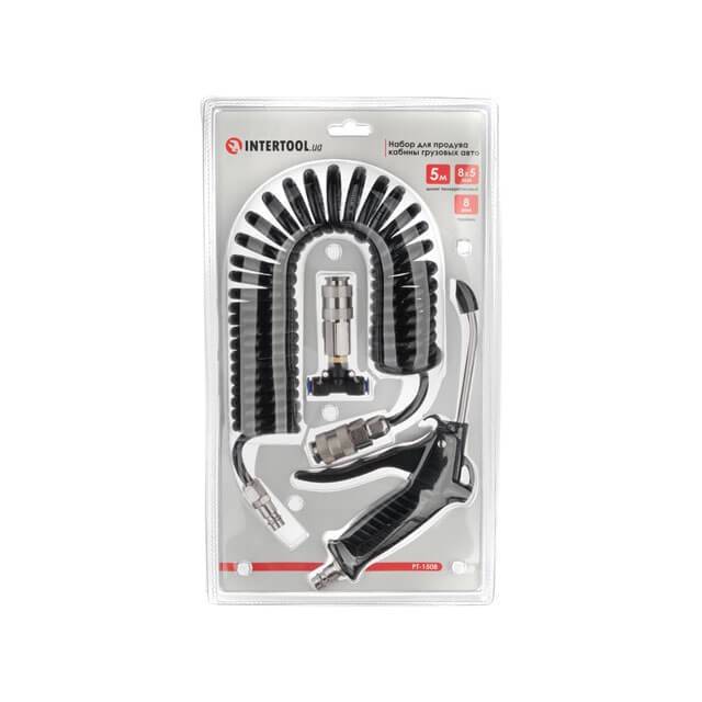 Набір для продування кабіни вантажних авто: пістолет, шланг поліуретановий 5 м 6*4 мм, трійник на шланг 6 мм; на швидкороз'ємних з'єднаннях INTERTOOL PT-1506