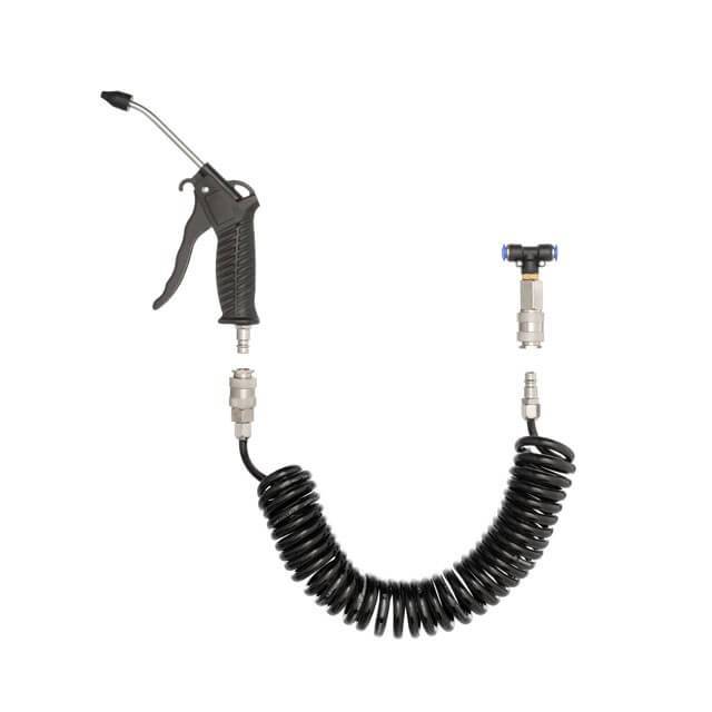 У комплекті передбачений трійник на шланг 8 мм, він допоможе у збиранні пневматичної системи. Крім цього, шланг комплекту оснащений швидкороз'ємним з'єднанням європейського типу, а пістолет продування відповідним фітингом, що дозволяє швидко під’єднати пневмоінструмент до шланга, а шланг - до компресора.